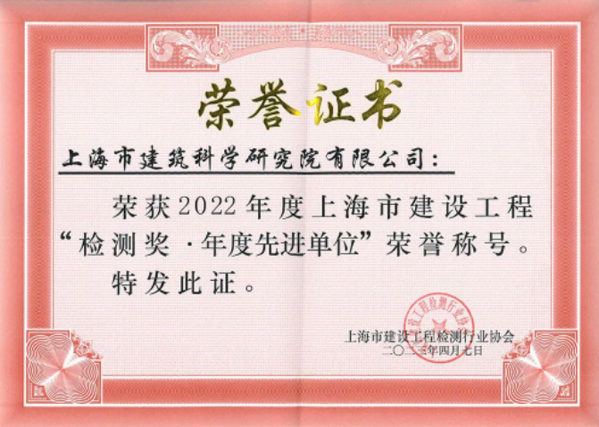 上海建科院荣获“2022年度上海市建设工程检测奖·年度先进单位”2023-04-25