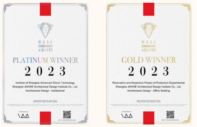MUSE Design Awards缪斯设计大奖2023年度获奖名单公布,上海建科集团成员企业上海建科建筑设计院有限公司荣获4个奖项,原创设计的上海超硅研究院项目荣获铂金奖,原创设计的上海建科莘庄园区十号楼荣获金奖,另...