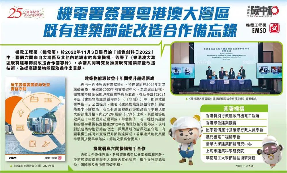 近日,上海市建筑科学研究院有限公司与香港特别行政区政府机电工程署、香港绿色建筑议会、澳门机电工程师学会、清华大学建筑节能研究中心等7家机构共同签署粤港澳大湾区既有建筑节能改造合作备忘录。