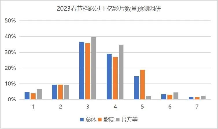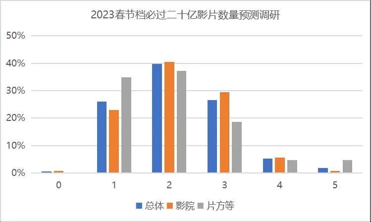 认为能有2部影片过20亿的仍然最多占到40%,而近两年春节档也均有2部影片过20亿大关,今年是否能继续有2部+影片能过20亿,从摸底调查看超7成认为是肯定可以的;