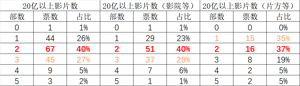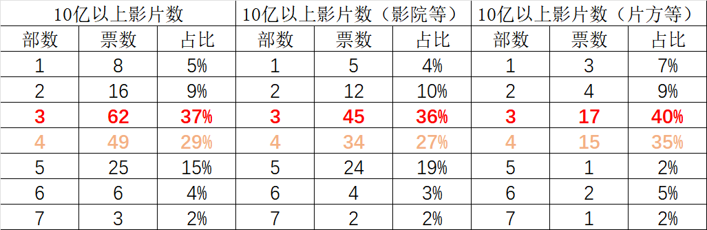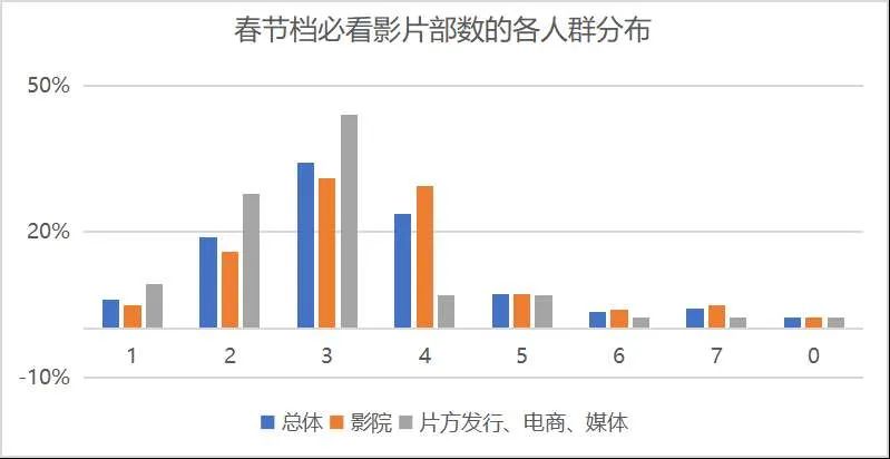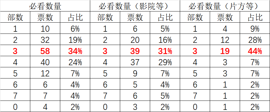 今年必看部数仍然3部占比最高,相对来说今年业内只有75%必看部数超3部,较往年此比重略有降低,意味着今年影片整体的平均吸引力略有下降;