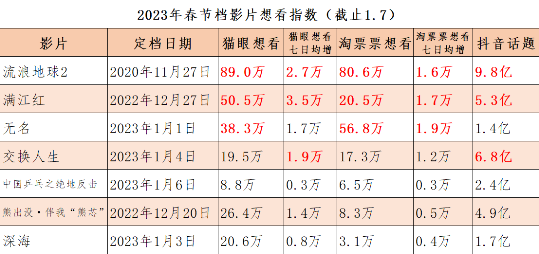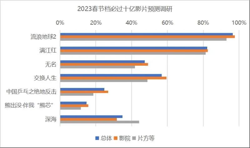 几乎所有参与调研的业内人士均认为《流浪地球2》过10亿无悬念,《满江红》也超8成认为能过10亿,《交换人生》也超5成认为能过10亿,《无名》也有近5成认为能过10亿;《深海》也是近几年最被看好能过10亿的国产动画,认为过10亿的约有3成;