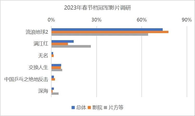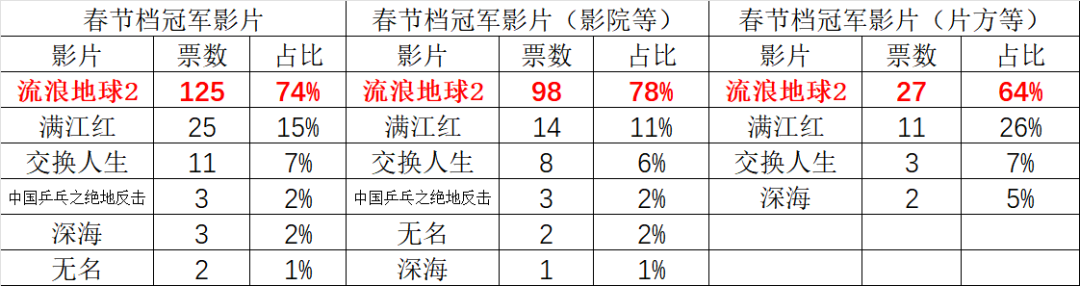 从投票结果看,毫无悬念,无论是影院代表还是片方代表,都过半数认为《流浪地球2》能获得春节档冠军;尤其影院代表近8成认为《流浪地球2》能夺冠,但整体仍有15%的投票认为《满江红》能夺冠;今年是否还会上演“逆袭”让我们拭目以待;