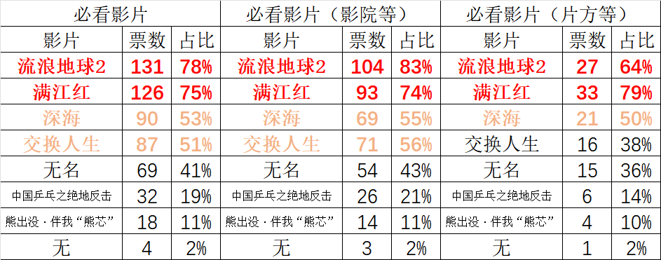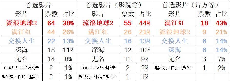 首选《满江红》次选影片情况如下:《流浪地球2》占36%、《无名》占27%,《交换人生》及《深海》占16%,《中国乒乓》5%;
