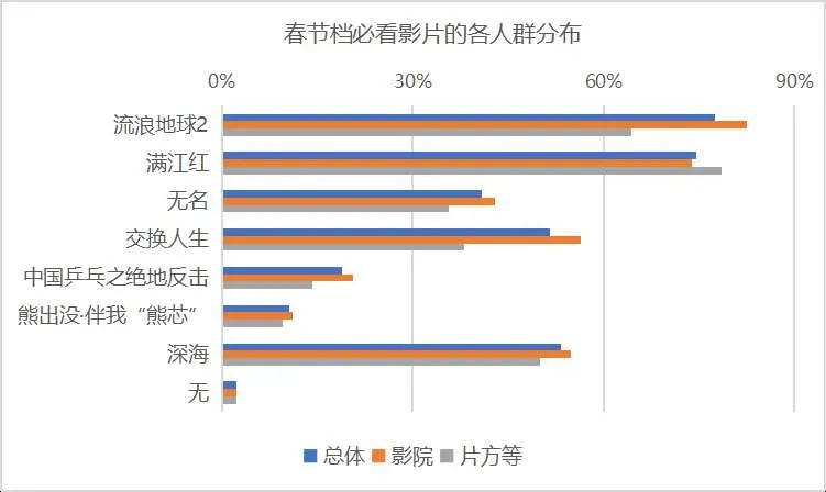 从业内期待度来看《流浪地球2》及《满江红》两片处于绝对领先的地位,都超7成代表列为必看,其中《流浪地球2》超8成的影院代表列为必看电影;而在片方阵营中《满江红》期待度最高;而《深海》无论影院还是片方代表都超5成必看,是近几年春节档动画影片成人观众期待最高的影片;《交换人生》在影院代表中也有超5成表示必看;《无名》总体也有约4成列为必看影片;